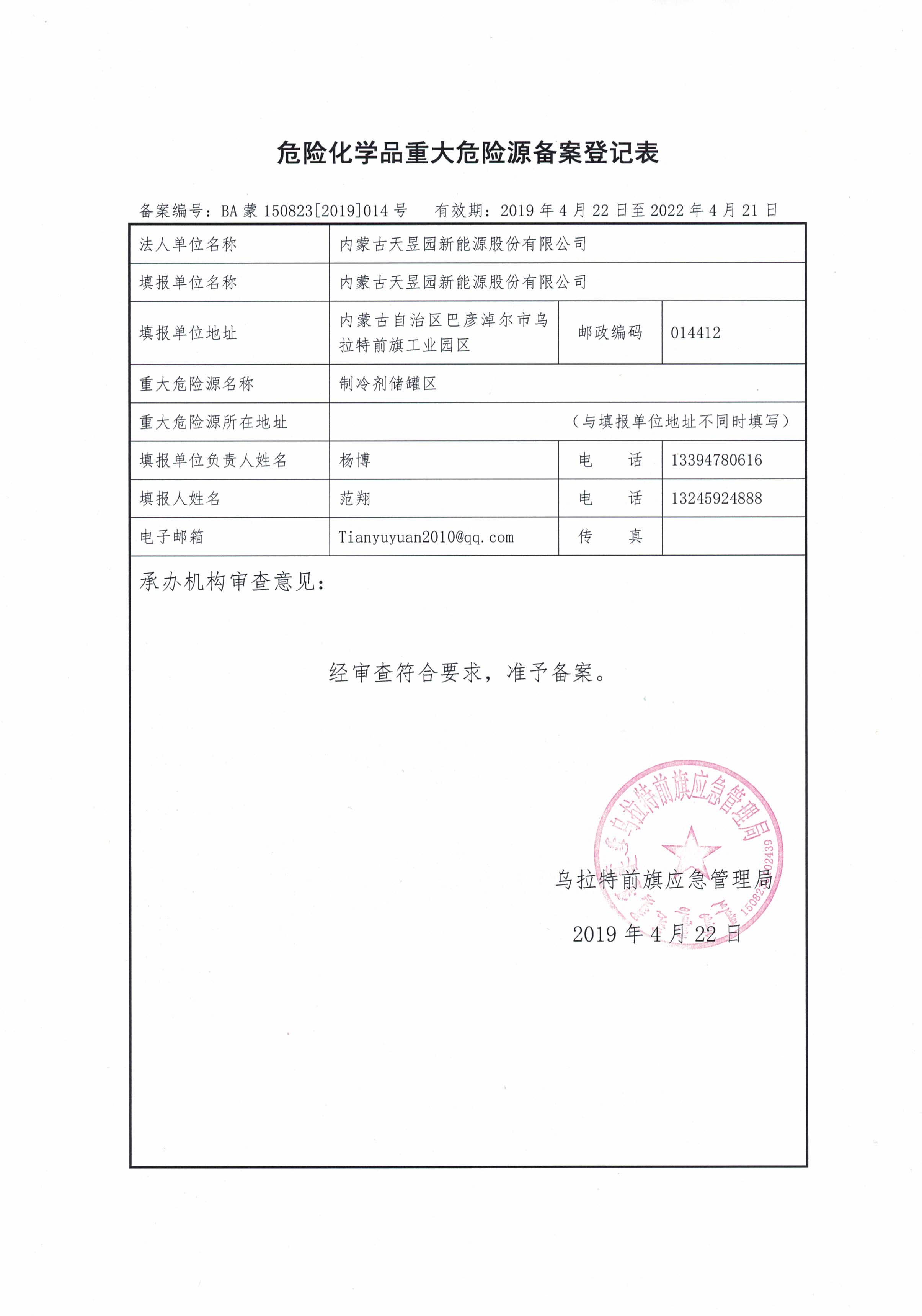 我公司于2019年4月22日对《危险化学品重大危险源备案登记表(LNG储罐区)》、《危险化学品重大危险源备案登记表(制冷剂储罐区)》取得备案,现将上述文件及《应急疏散图》共同进行公示!