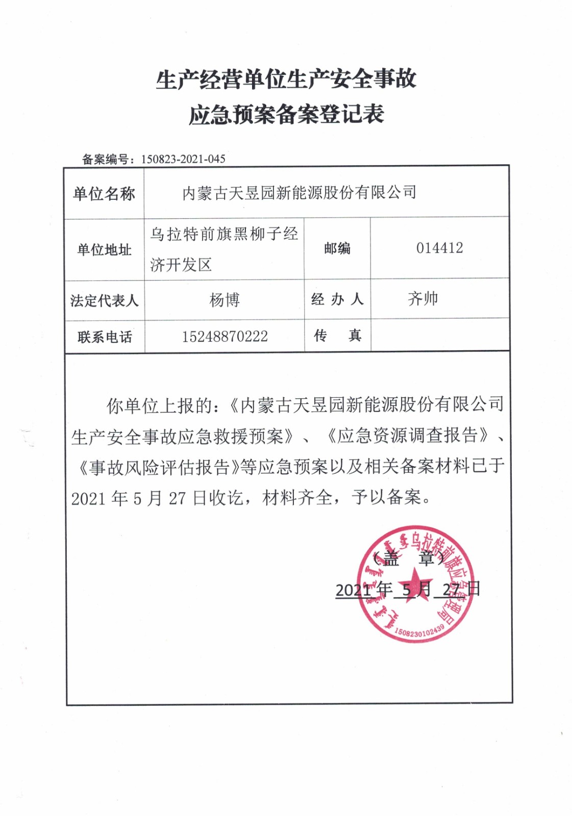 我公司于2021年5月27日对《生产经营单位生产安全事故应急预案备案登记表》取得备案,现将上述文件及《应急疏散图》共同进行公示!