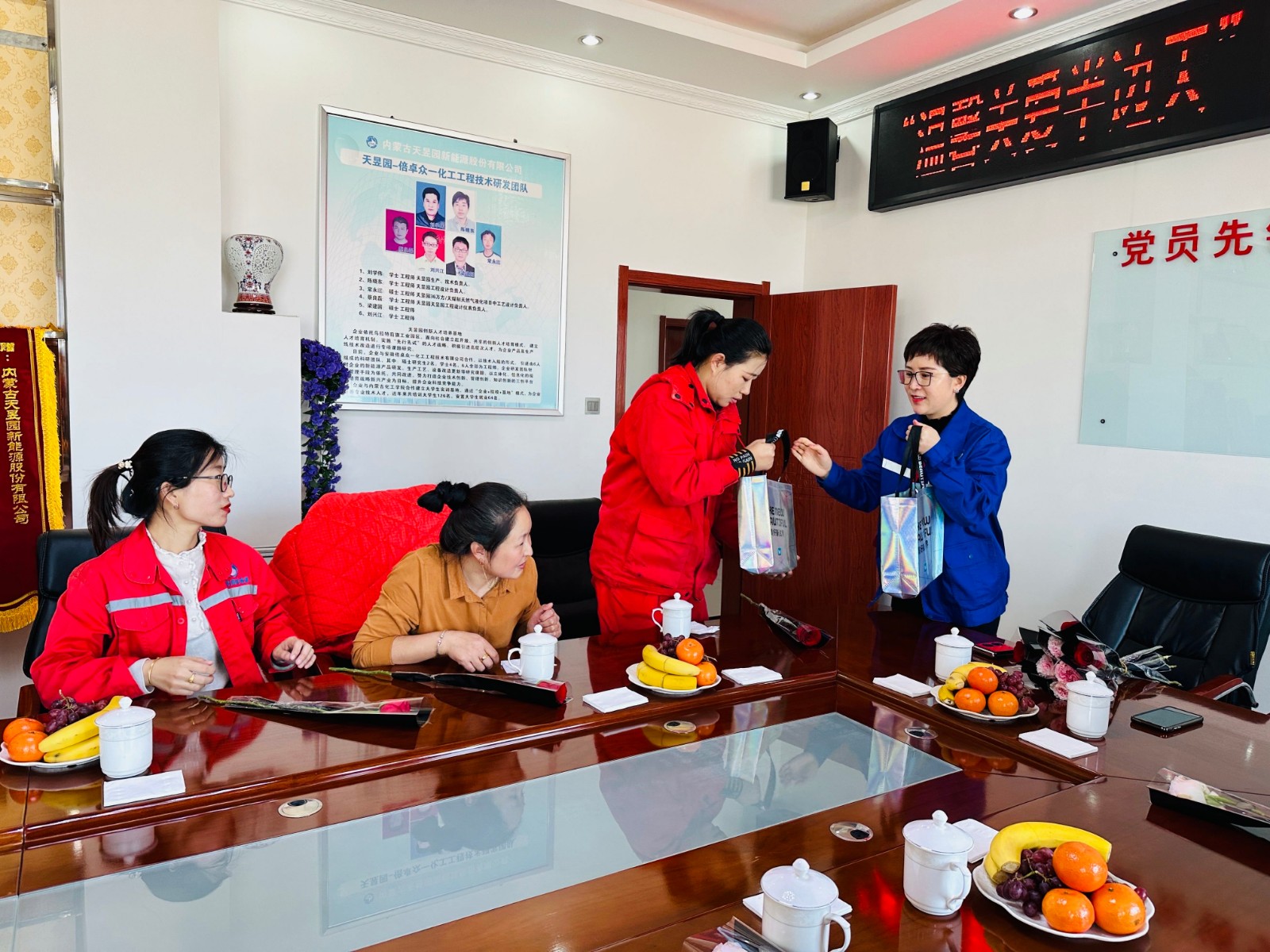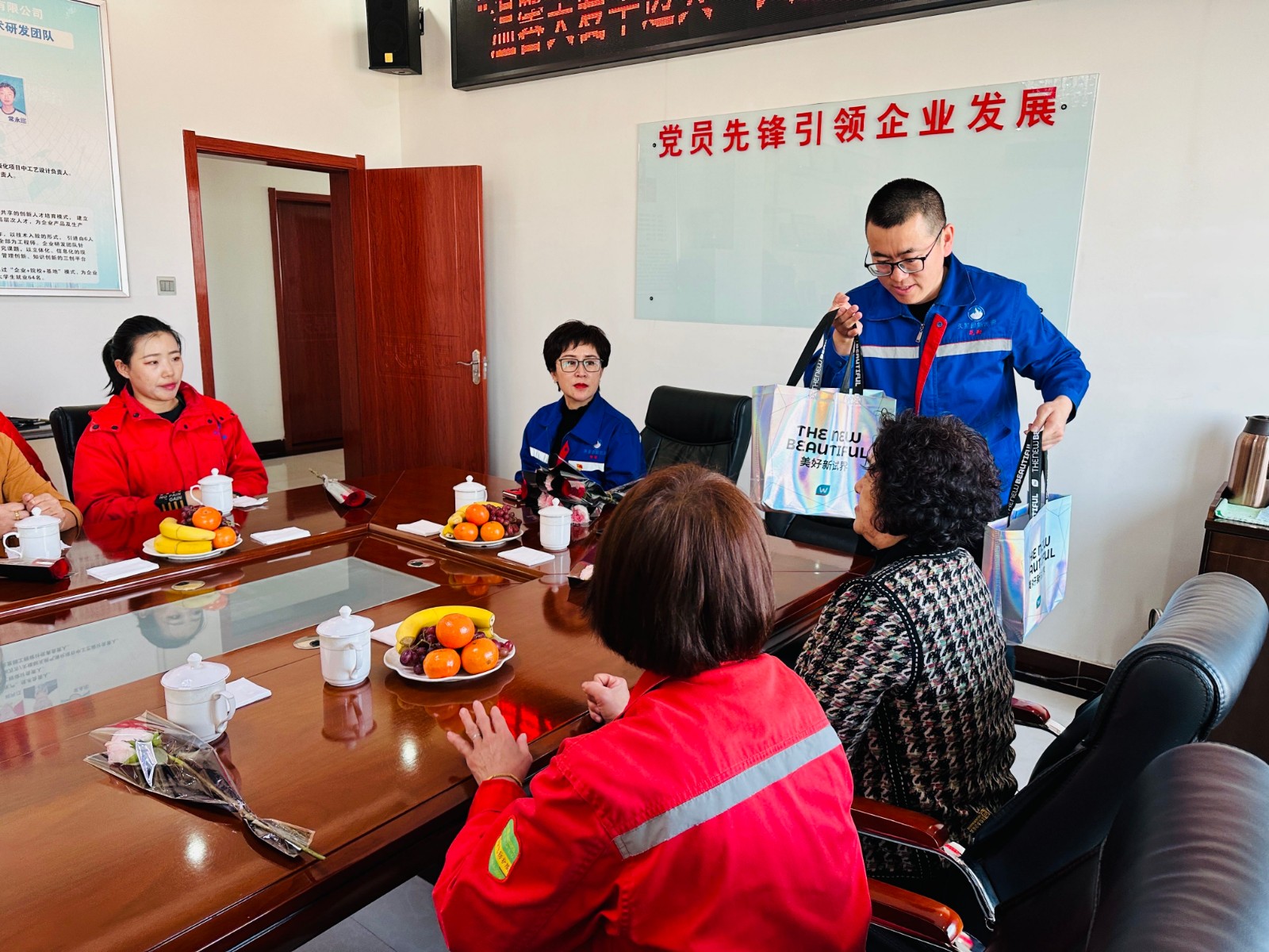 在此次座谈会入座前,公司党支部书记杨丽与工会主席范翔共同为各位女职工们献上了代表热情、无私和浪漫的红玫瑰和代表热爱、尊敬和伟大的康乃馨以及充满祝福的节日礼物。